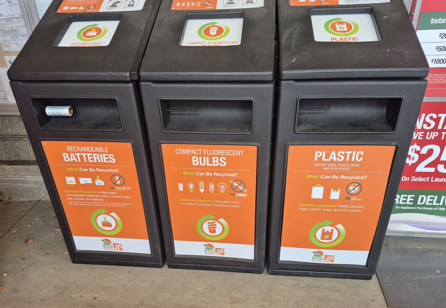 Rechargeable Batteries, Compact Fluorescent Lightbulbs and Plastic Bags can be recycled at most Home Depots, including the East Windsor Home Depot.